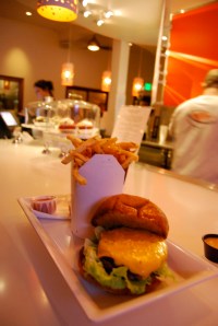 The fries and rings were nothing out of the ordinary and although I would have a burger again, I would definitely skip any fried accompaniments. Eating in the tiny, trendy, orange-tinted establishment instantly transported me to one of the hipper places in L.A. where the young go out to have a burger without resorting to a fast food establishment.