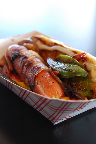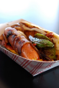Another item of note that was consumed was their TJ hotdog: an all-beef hotdog wrapped in bacon and topped with ketchup, mustard, mayo, grilled onions and peppers. At $1.50 the price was right but the combination of all the ingredients did not rest well with me. But I suspect that it faired better with me than, say, actually eating it from a hotdog cart in Tijuana. It was a nice effort on their part but something I would skip altogether next time. If I wanted something to remind me of Tijuana, I would instead order the pineapple-flavored Jarritos they had available.