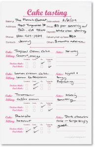 Prior to a cake tasting, I grab the nearest pad and bring it along for notes. When I posted photos of a recent cake tasting, I didn’t think that this notepad in the photo would attract any attention. I was wrong.