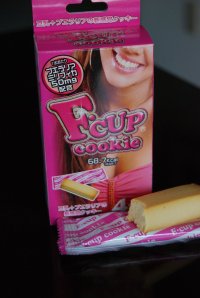 The F*Cup cookie was something I picked up at Nijiya for the, ahem, packaging. I got it as a joke for Paul, but when it rang up on the register, it was almost $5 for four cookies. What exactly did I pick up and why was the cashier checking me out? It seems that F*cup cookie claims to have breast-enhancing herbs that will increase your cup size to a double D.