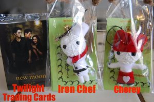 All you have to do is leave a comment of which one you want and I’ll randomly chose one person to send it off to. I’m also throwing in trading cards for Twilight that somehow made it into my swag bag.