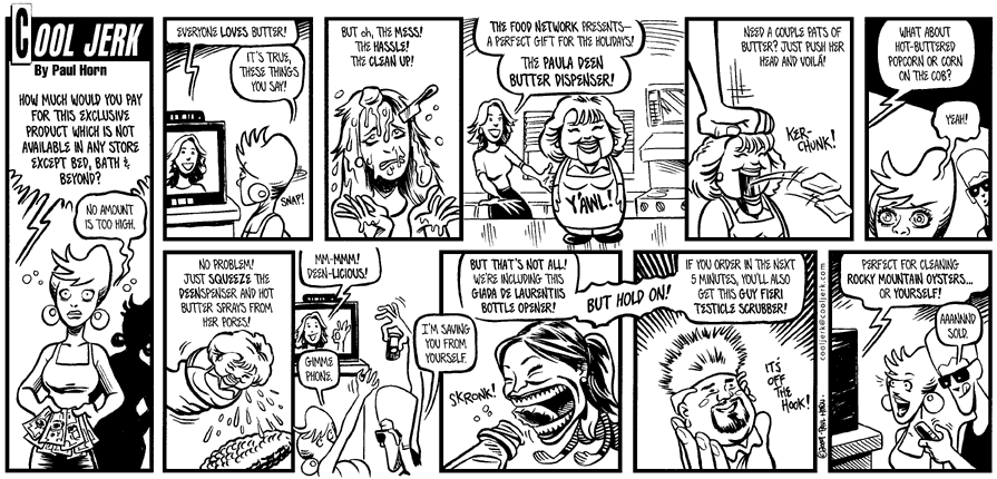 Some of the gags above should come as no surprise if you know me. Thinking about Paula Deen deep-frying bacon in butter was the impetus for my strip, instead of the more recent (and much more exciting) news. I actually adore Giada and find it hard to say anything overly critical of her, except maybe for her resemblance to a De Laurentiisaurus Rex. And Guy Fieri? I know he’s an easy target. But on the upside, a good friend of ours will have her café featured on “Diners, Drive-Ins and Dives” soon. So that’s a good thing. (More to come on that; I don’t want to steal any thunder or jinx anything.)