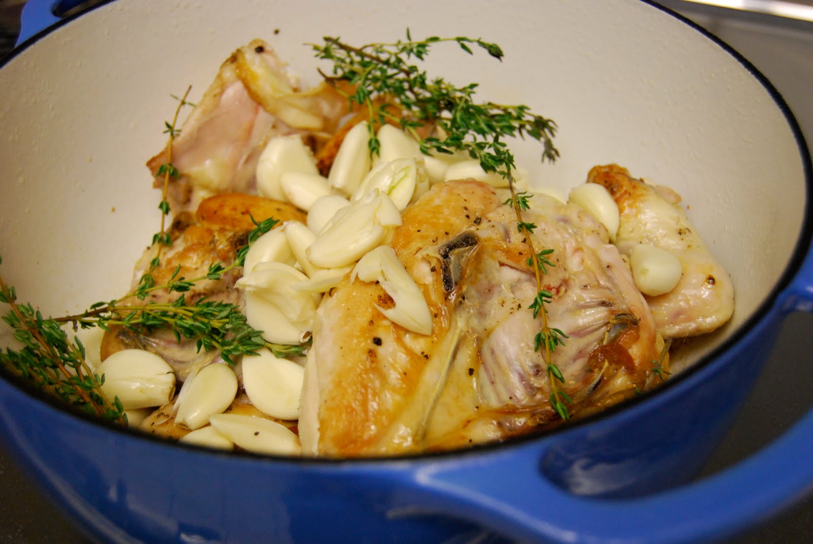 It’s a very easy recipe using a whole chicken cut into pieces, browned in the dutch oven and placed in the oven to cook with thyme, olive oil and lots of garlic. It requires a lot of olive oil but I replaced some of the oil with white wine. After everything is cooked, the garlic is easily smushed with a fork.