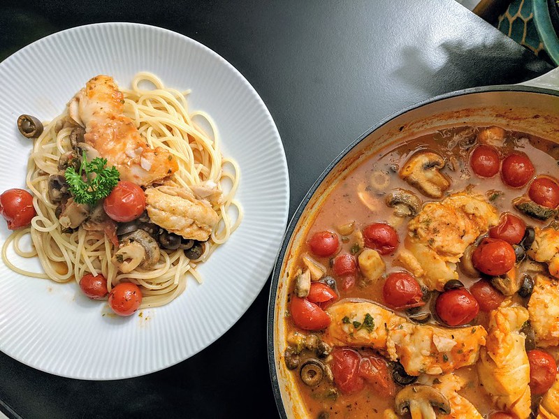Simmered Cod in Tomatoes, Mushrooms and Olives