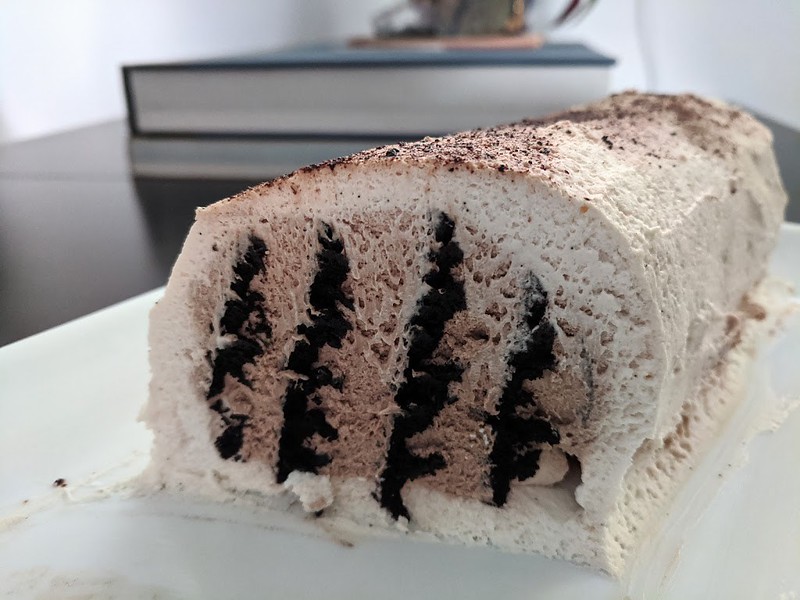 Assembling the cake is super easy and the only equipment you need is a hand mixer to whip the cream. While there are variations on assembling icebox cakes, I went with the traditional log shape. The wafer cookies, which are not until unlike the cookies used for Oreos, are layered and placed on its side until all the cookies are used up and the remaining whipped cream is used to cover the entire “cake.”