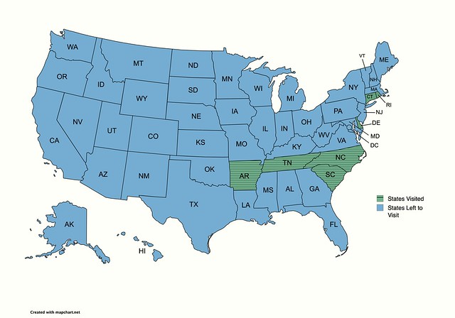 States left to visit are Arkansas, Tennessee, both the Carolinas, Delaware, Connecticut, and Rhode Island — just 8 states!